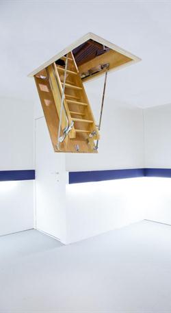 Le Junior 2B se compose de 2 éléments coulissants. Le système de bascule se compose d'un appareil à ressorts spéciaux qui tient la trappe et l'escalier à tout moment en parfait équilibre assurant ainsi une sécurité de 100 %.